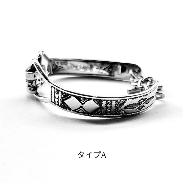 伝統的な柄が施されたシルバーのプレート2つを別のシルバー素材で連結させたあまり見かけないデザイン。